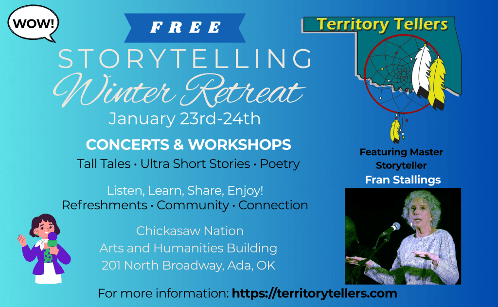 This annual event shall provide through collaboration with the Chickasaw Nation an opportunity for members and friends to once again gather for an enjoyable weekend. We will hear and share stories in a relaxed setting. Stories shall be shared on stage, in story circles, during interactive workshops, and more. Come enjoy this free event and join the fun.